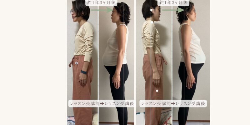 なんとこちらの生徒様、右側のレッスン受講後のお写真のときは、妊婦さん…それも臨月まじかの状態です。